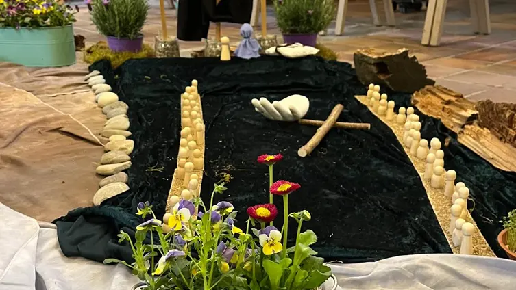 Für den diesjährigen Familiengottesdienst am Ostermontag hatte sich das Mitarbeiterteam des Kindergottesdienstes etwas ganz Besonderes einfallen lassen. Mitten in der Barbarakirche gestalteten sie mit einer Vielzahl an Blumen und Grüngewächsen, Moos, Baumrinde, Treibholz und Steinen einen wunderschönen Ostergarten.