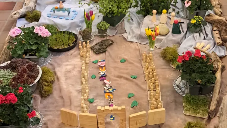 Während des Gottesdienstes, den der Flötenkreis der Kirchengemeinde musikalisch mitgestaltete, erzählte Schmetterling Taddäus wie er die letzten Tage Jesu vom Einzug in Jerusalem, Karfreitag und Ostern bis zu den Emmaus-Jüngern miterlebt hatte. Zu jeder Geschichte gestalteten die Kindergottesdienstkinder mit vielfältigen Gegenständen und übergroßen Spielfiguren im Ostergarten die einzelnen Szenen, was Taddäus, über dem Garten schwebend, beobachten konnte.
