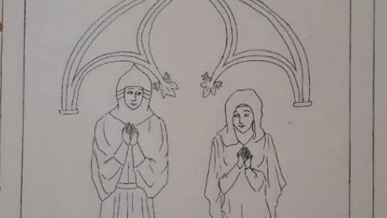 Die älteste Grabplatte stammt von Ritter Diderich von Rinberg (+ 1396) und seiner Frau Utila (+ 1390). (Abb. 175+176) Ursprünglich lag dieser Doppelgrabstein aus rotem Sandstein unter den vorderen Frauenstühle, bis er 1875 in die Wand des Chores eingelassen wurde. Er zeigt unter einem gotischen Aufbau in Ritzzeichnung das Paar in Lebensgröße. Links Diderich mit einem spitzen Reiterhelm, rechts Utilia mit einer mehrfach gewundenen Kopfbedeckung, beide fromm die Hände über der Brust gefaltet. Darüber erkennt man die Wappen von Rinberg (rote Binde im silbernen Feld) und von Winnenberg, sowie in den vier Ecken nicht mehr erkenntliche Ahnenwappen von den Eltern des Paares. Schwach erkennbar, oberhalb der Figuren befindet sich ein Schmuckband, das das Paar symbolisch verbindet. Dieses Grab ist die einzige bekannte Grablege des Ministerialiengeschlechtes der von Rheinberg. Wo sich die sterblichen Überreste des Ritters und seiner Gattin genau befinden, kann niemand mehr sagen.